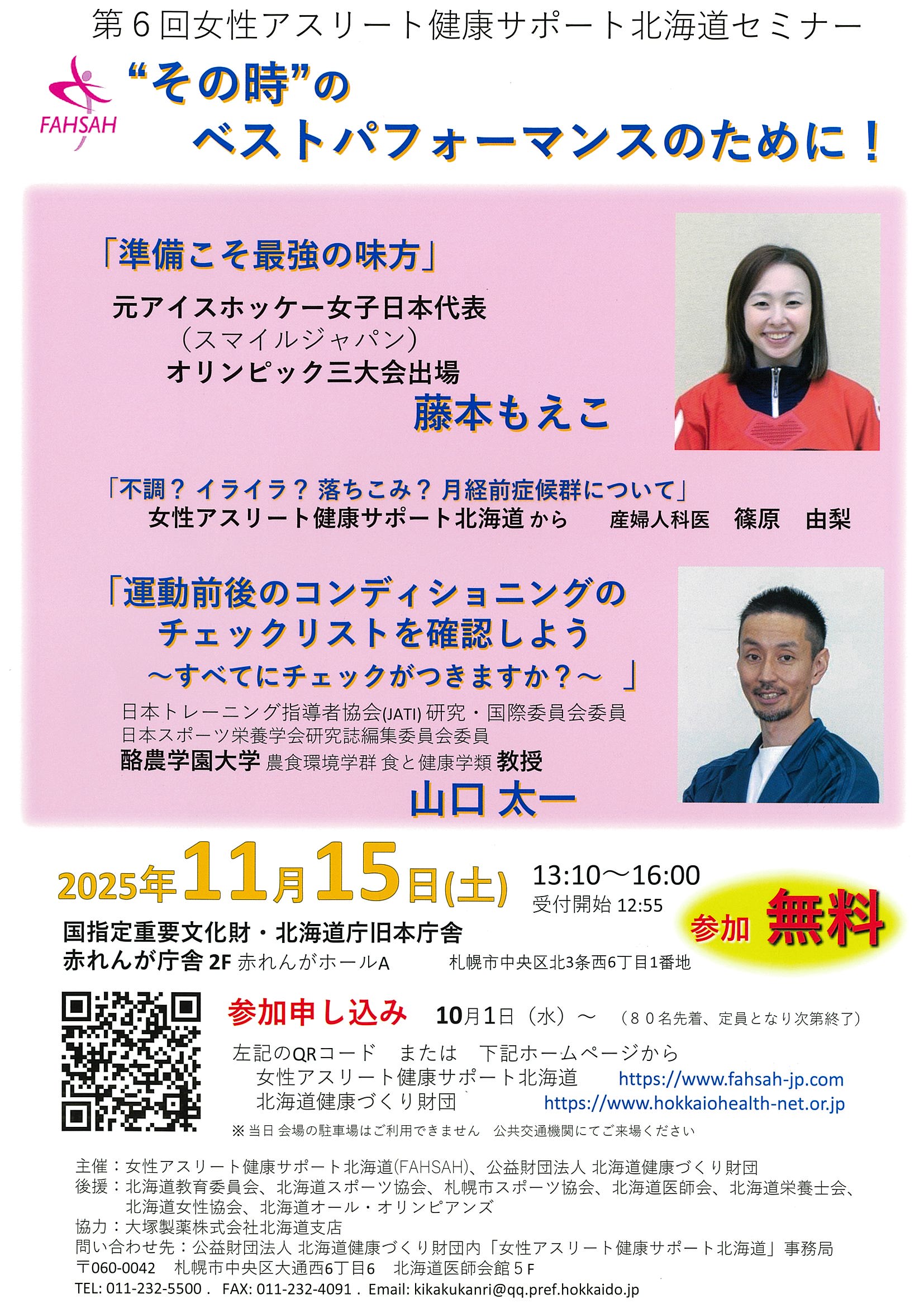 ホーム 研修・イベント 研修・イベント一覧 イベント 第6回女性アスリート健康サポート北海道セミナー参加受付中 開催日2025.11.15 詳細 イベント すこやかロードを歩こう!in大倉山ジャンプ競技場メモリアルコース 開催日2025.10.18 詳細 研修 ノルディックウォーキング普及推進員養成講習会の開催について(滝川市) 開催日 詳細 1
